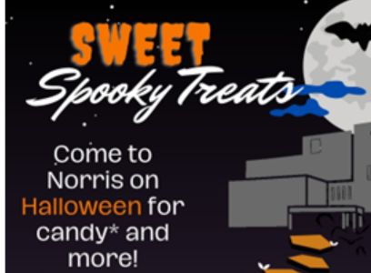 Come to Norris for FREE candy to kick off your Halloween celebration! A variety of candy on every floor. Just follow the ghosts and spiders to lead you on the sweet treat trail. While supplies last. Also featuring a Halloween selfie booth. Get a photo with costumes and props.