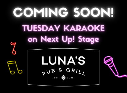 Beginning January 6, 2026, join us for our weekly programming on Next Up! Stage! in Luna's Pub & Grill! Gather your friends for Tuesday Night Karaoke, Thursday Trivia, Variety Nights, and more!