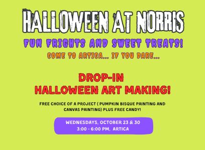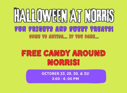 Come to Norris for FREE candy to kick off your Halloween celebration! A variety of candy on every floor. Just follow the ghosts and spiders to lead you on the sweet treat trail. While supplies last. Also featuring a Halloween selfie booth. Get a photo with costumes and props.